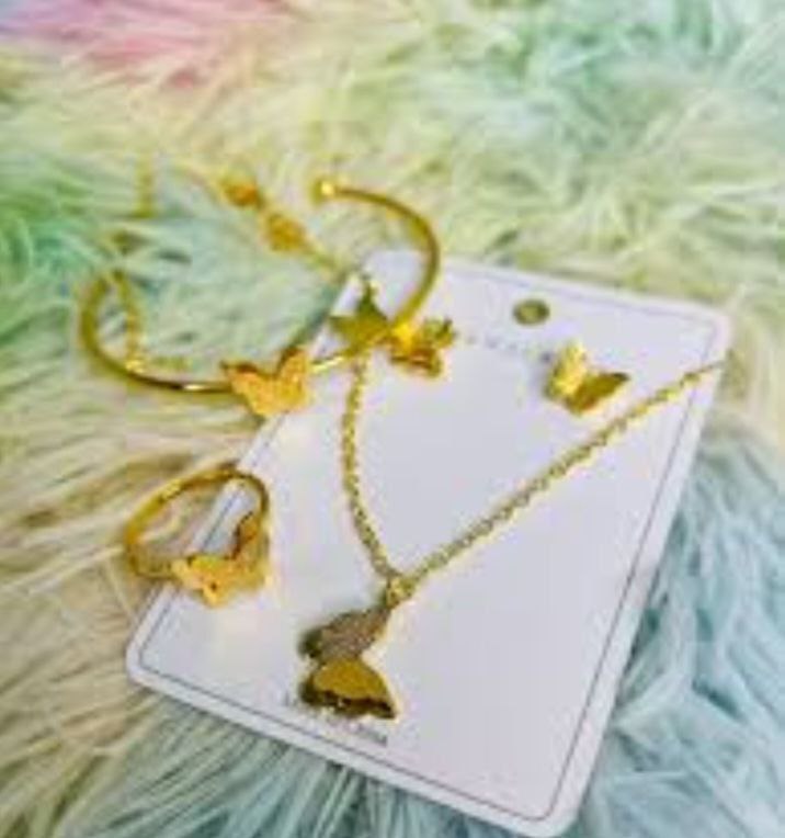 সেটের উপাদান: প্রজাপতি লকেটযুক্ত নেকলেস, দুটি প্রজাপতি আকৃতির কানের দুল, ব্রেসলেট বা আংটি