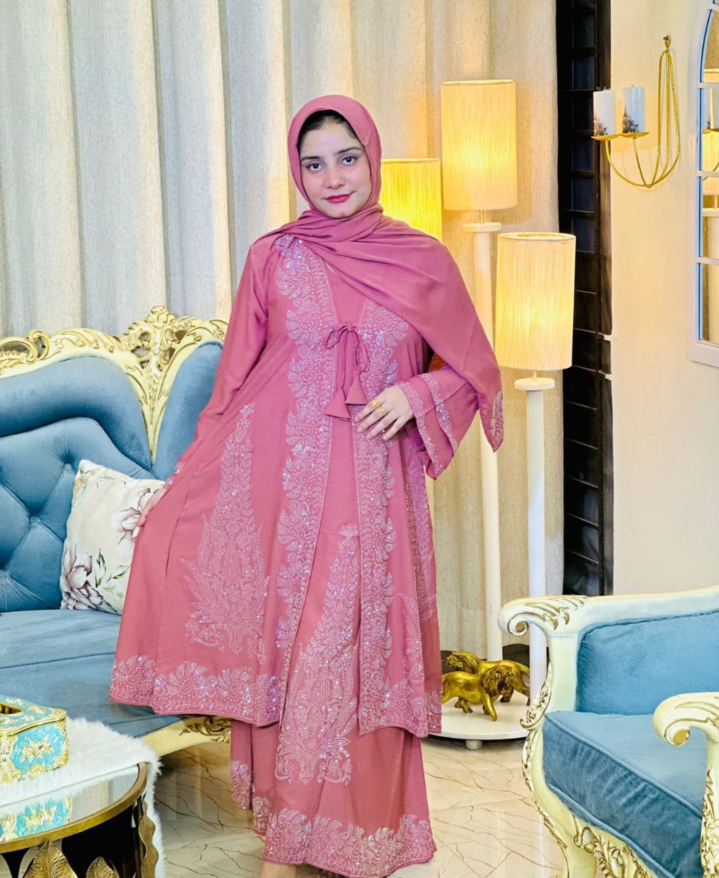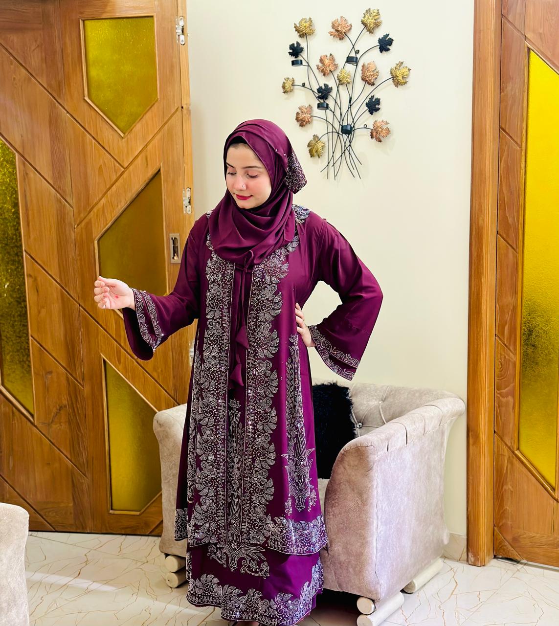 সাথে রয়েছে ম্যাচিং হিজাব (Dupatta) এমব্রয়ডারি ডিজাইনসহ।